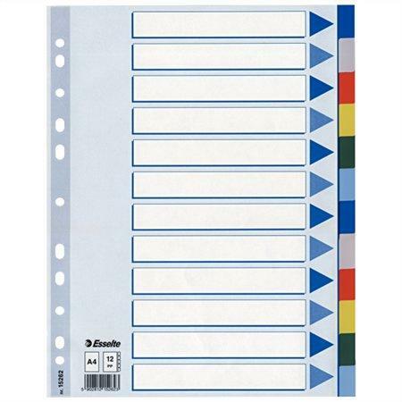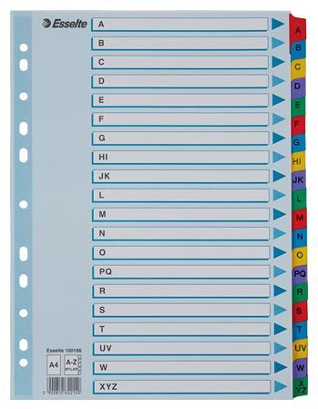 Regiszter, műanyag, A4, 20 részes, ESSELTE - elválasztólap visszafogott színkombinációkban - nagyméretű téglalapok az előlapon a tartalom feltüntetésére - 20 színes fül a könnyű rendszerezéshez - megerősített lefűzőrész az előlapon - hagyományos, 11-lyukú lefűzőrész - 0,12 mm vastag PP alapanyag