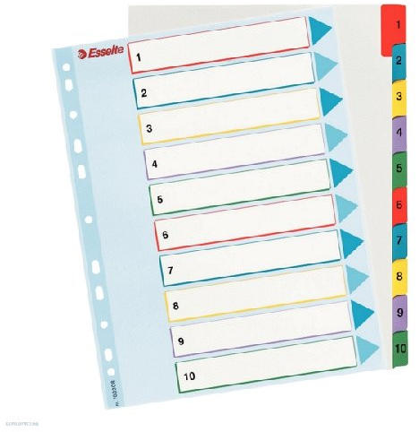 - többször használható regiszter élénk színkombinációkban - nyomtatható tárgymutató az egyedi igényekhez - a sablon a www. esselte. com/easyprint oldalról tölthető le - az A4+ méretű regiszterek szélesebbek a lefűzhető tasakoknál, így segítségükkel az iratrendezőbe lefűzött tasakok is könnyen rendszerezhetők - erős és tartós polipropilén alapanyag - nyomtató seg
