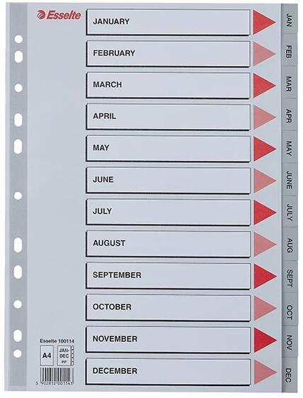 Szürke színű regiszter. Nagyméretű téglalapok az előlapon a tartalom feltüntetésére. Megerősített lefűzőrész az előlapon Jan-Dec felirattal rendelkező regiszter fülek a dokumentumok gyors eléréséhez Hagyományos, 11-lyukú lefűzőrész A4 méret 0,12 mm vastag PP alapanyag