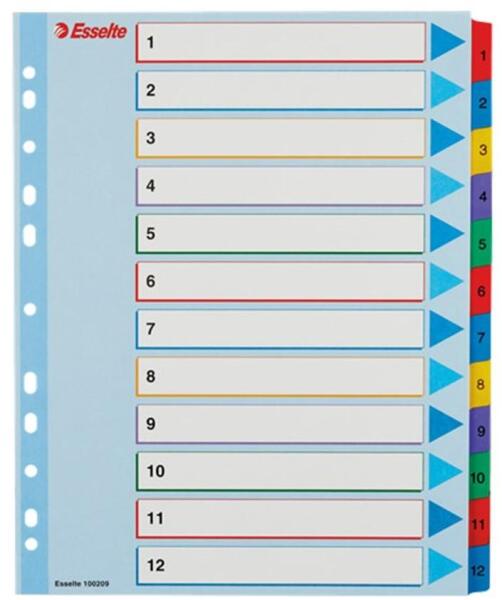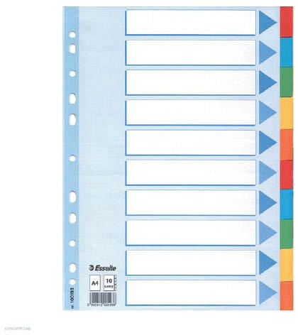 Regiszter, karton, A4, 10 részes, írható előlappal, ESSELTE "Standard", színes- tartós elválasztólap élénk színkombinációkban - újrahasznosított, Blue Angle minősítéssel rendelkező karton alapanyag - nagyméretű téglalapok az előlapon a tartalom feltüntetésére - megerősített lefűzőrész az előlapon - hagyományos, 11-lyukú lefűzőrész - 10 színes fül a könnyű r