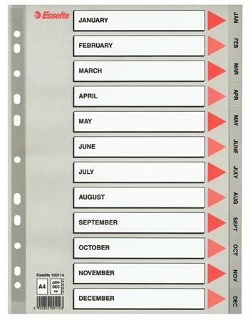Regiszter, műanyag, A4, Jan-Dec, Esselte, szürke - szürke színű regiszter - nagyméretű téglalapok az előlapon a tartalom feltüntetésére - Jan-Dec felirattal rendelkező regiszter fülek a dokumentumok gyors eléréséhez - megerősített lefűzőrész az előlapon - hagyományos,