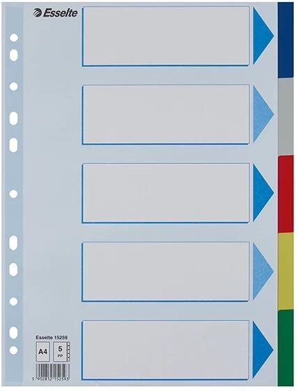 Elválasztólap visszafogott színkombinációkban. Nagyméretű téglalapok az előlapon a tartalom feltüntetésére. Megerősített lefűzőrész az előlapon 5 színes fül a könnyű rendszerezéshez Hagyományos, 11-lyukú lefűzőrész A4 méret 0,12 mm vastag PP alapanyag