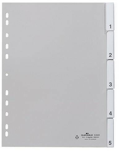 Elválasztólap PP Durable A/4 1-5-ig szürke PP index szett, feliratozható fülekkel Formátum: A4, álló, teljes Magasság x szélesség (mm): 297 x 215/230 Lapok száma: 5
