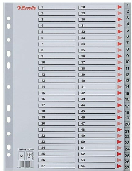 Regiszter ESSELTE A/4 műanyag 1-54 szürke Szürke színű regiszter. Nagyméretű téglalapok az előlapon a tartalom feltüntetésére. Megerősített lefűzőrész az előlapon 1-54 felirattal rendelkező regiszter fülek a dokumentumok gyors eléréséhez Hagyományos, 11-lyukú lefűzőrész A4 méret 0,12 mm vastag PP alapanyag