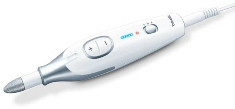 Be-/kikapcsoló bekapcsolásvédővel Pót tartozékok kaphatók LED lámpa 3 dörzspapír feltéttel a bőrkeményedés hatékony eltávolításához 1 db finom és 2 db durva feltét Tisztítóecsettel Védősapkával Nagy teljesítményű motor Elemmel működik 2 x 1,5 V AA elemmel