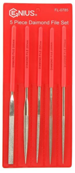 5 kis gyémántbevonatú reszelő, kiváló az egészen kis sík, üreges felületek illesztésére, kemény anyagok, acél, üveg, kerámia, stb. megmunkálásához, és az apróbb finomítások, sorja eltávolításához. Méretükből adódóan kis mennyiségű forgácsot képesek leválasztani a felületről. Szárátmérő: 4mmA készlet lapos, háromszög, négyzet, kerek, félkerek profilla