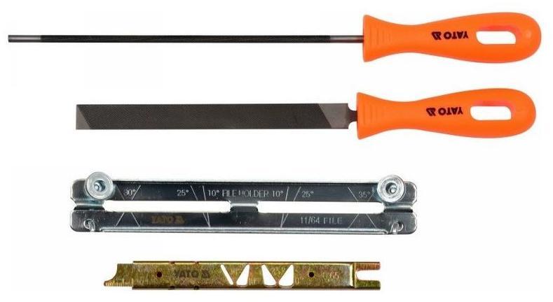 Négy részes készlet fűrészláncok élezéséhez. A készlet tartalma: kerek reszelő fájl útmutató lapos reszelő mérő az őrlési mélységütközőkhöz További információ: reszelők csapágyacélból 25°, 30° és 35°-os szögben történő élezésre szolgál átmérő: 4,8 mm 0,325"-os láncokhoz polipropilén fogantyúk feltekerhető, cipzáras tokban Cél: Láncfűrész lánc