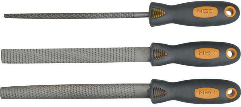 A NEO ráspolykészletben három db 200 mm hosszú ráspoly van, lapos, félkerek és kör keresztmetszettel. Fa csiszolására szolgál. Kiváló minőségű, nagy keménységű T12-es acélötvözetből készül. Az ergonómikus, TPR bevonatú nyél biztosítja a kényelmet és a biztonságot a munkavégzés során. A NEO márka a professzionális igényeket is kielégíti.