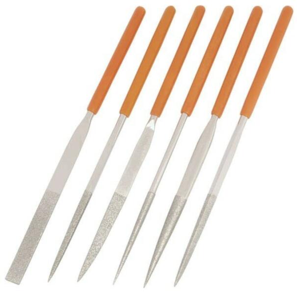 Termék leírás: Prezízen kialakított reszelő testre galvanikusan felvitt gyémántszemcsék, ez hosszú élettartamot biztosít a gyémánt reszelőnek. Edzett acélok, keményfémek, üveg, kerámia és szálerősítéses műanyagokra használható a reszelő. Tűreszelő készlet 6 db-os 4x160x50 mm gyémántozott HRC38- 42 szénacél 100% krómozott