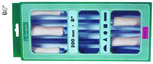 KAISER Reszelő klt. 200 mm 5 részes, fa nyéllel, kaertondobozban, 1-es vágás 5 részes fanyelű reszelő készlet, kartondobozban. 1-es elővágó kivitel: nagyolási munkákhoz és puha anyagokhoz Anyag: edzett szerszámacél , fa nyél 1-1 db lapos, háromélű, négyélű, félkerek és kerek reszelő