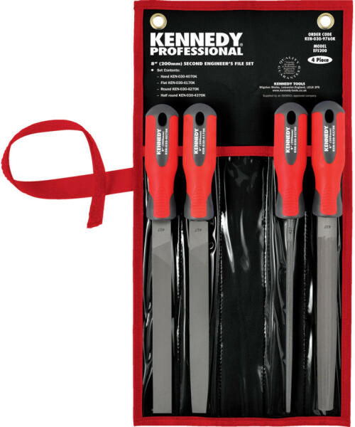 4 db mérnöki reszelő készletben, ergonómiai kialakítású nyéllel a kényelmes, jobb fogás érdekében. A reszelők edzett és megeresztett T12-es szerszámszénacélból készültek. Tartozék szőtt tárca a könnyebb tárolás érdekében. A készlet lapos műhelyreszelőt, valamint lapos-, kerek és félkerek mérnöki reszelőt tartalmaz. A BS498:1990 és a GGG-F325B Amerikai Szövets