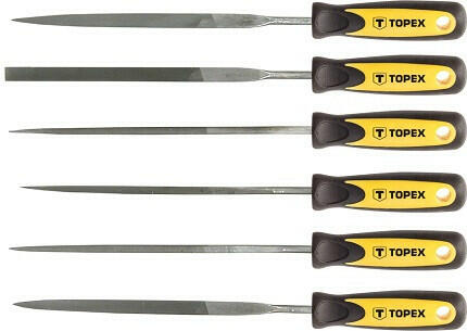 TOPEX tűreszelő készlet, hosszúságuk 150 mm, átmérőjük 3 mm. Fémek precíziós reszelésére szolgál elsősorban. A hat univerzális alak lehetővé teszi legkülönfélébb alkalmazásukat. Az ergonómikus alakú, bimateriál markolat jól fekszik a kézben, ami nagyon komfortossá teszi használatát. A TOPEX márka ezermestereknek készül. Tűreszelő klt. fémhez, 6 db?os, L 150 mm