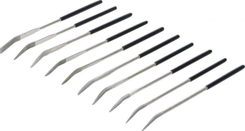 Megoldást ajánl a simítómunkában olyan anyagoknál, melyek keménységük miatt hagyományos reszelőkkel nem munkálhatók meg. wolframkarbid, kerámiák, karbon, üveg, üvegszál, edzett acélok, rozsdamentes acél, titán, stb műanyag nyéllel a stabilabb tartás érdekében bevonata 120-140 szemcseméretű gyémántpor 1-1 db lapos, félkerek, háromszög, kerek, négyszög és késpeng