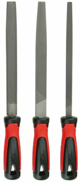 Alak: lapos, félkerek, háromszög Ez a fémreszelő készlet három reszelőt tartalmaz, amelyek T12-es acélból készültek, ami hosszú élettartamot biztosít. A reszelők fém, acél, alumínium, sárgaréz vagy műanyag megmunkálására alkalmasak. A készlet lapos, félköríves és kerek reszelőből áll. A két anyagból készült fogantyú kontúrozott a jobb kényelem érdekében mu
