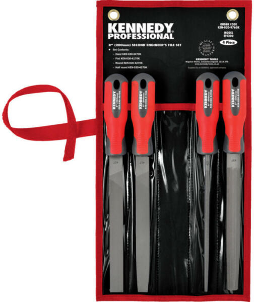 4 db mérnöki reszelő készletben, ergonómiai kialakítású nyéllel a kényelmes, jobb fogás érdekében. A reszelők edzett és megeresztett T12-es szerszámszénacélból készültek. Tartozék szőtt tárca a könnyebb tárolás érdekében. A készlet lapos műhelyreszelőt, valamint lapos-, kerek és félkerek mérnöki reszelőt tartalmaz. A BS498:1990 és a GGG-F325B Amerikai Szövets