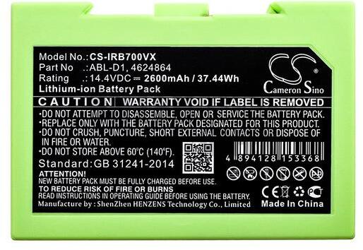 iRobot Roomba 7150 5150 7550 e5 e5150 e515020 e5152 e5154 e5158 e515840 e6 e6198 e619820 i7 i7+ i7158 i7550 i755020 i7558 series 4624864 ABL-D1 14.4V 2600mAh 37.44Wh Li-ion takarítógép akkumulátor utángyártott. Kompatibilis készülékek: iRobot Roomba 5150, 7550, e5, e5150, e515020, e5152, e5154, e5158, e515840, e6, e6198, e619820, i7, i7+, 7150, i7158, i7550, i755020, i7558 Kompatibilis pa