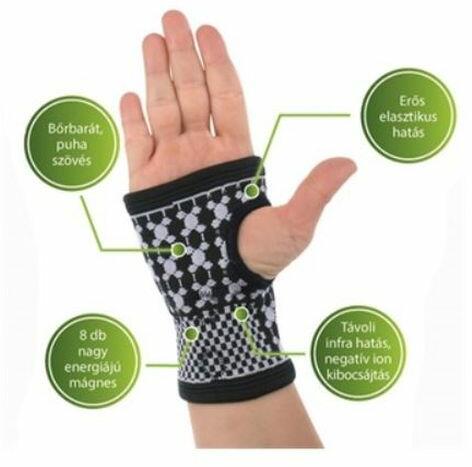 Mágneses csukló- és kézfejszorító turmalinnal, L méret, GYVFMKFL Intenzív mágnesterápia az anatómiailag fontos pontokon 8 darab, egyenként 1700-1850 Gauss erősségű mágneskoronggal. A turmalin az általa kibocsájtott távoli
