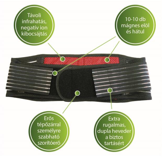 Intenzív mágnesterápia a jótékony hatású turmalinnal Elasztikus derékszorító extra rugalmas, gumírozott dupla hevederekkel biztosít kiváló tartást! Termékjellemzők: Intenzív mágnesterápia elöl és hátul 10-10 db egyenként 1800-2000 Gauss erősségű mágneskoronggal. A turmalin az általa kibocsájtott távoli infrasugaraknak és negatív ionoknak köszönhetően erősíthet