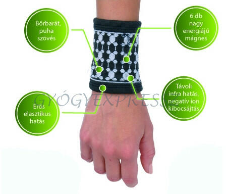 Mágneses Csuklószorító turmalinnal. Intenzív mágnesterápia az anatómiailag fontos pontokon 6 darab, egyenként 1700-1850 Gauss erősségű mágneskoronggal. A turmalin az általa kibocsájtott távoli infrasugaraknak és negatív ionoknak köszönhetően erősítheti a mágneses szorító ízületekre gyakorolt jótékony hatását. A termék ideális sporttevékenységekhez. Segítheti a