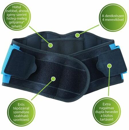Deréktámasztó öv Clima Comfort szövettel és Vario-Flex betéttel. Tulajdonságok: A Clima Comfort speciális szövésű anyag a bőr felületéről felszívja és az ortézis külső felületére vezeti a nedvességet, továbbá elősegíti annak elpárolgását, így a bőr felülete száraz marad, az ortézis viselete hosszú távú használat esetén is kellemes érzetet biztosít A tép
