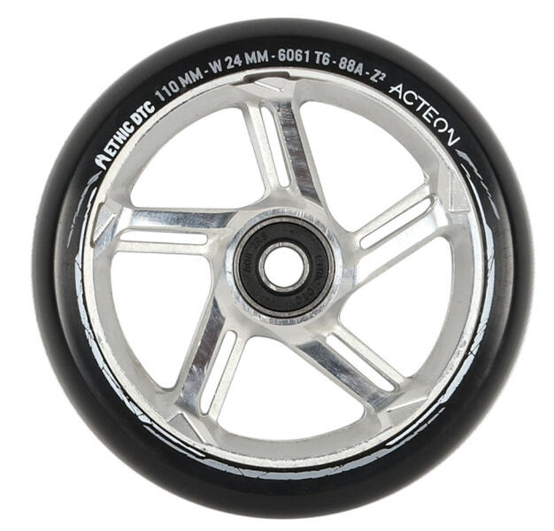 Az Ethic DTC legújabb innovációja, az Acteon 110 mm-es kerék, kiemelkedő választás azoknak, akik egy tartós és precíz gurulást keresnek. A 6061-es alumínium küllők borotvapengéhez hasonló elrendezésben találhatók a kerék magjában, ami egyedülálló megjelenést kölcsönöz. A 88A keménységű poliuretán felület kiváló visszapattanást nyújt, ami különösen fontos az