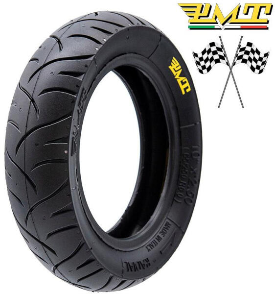 PMT E-Fire 10x2.5-R6 roller külső gumi (tubeless, radial, 65/250-R6, utcai)Városi mintás tubeless elektromos roller külső gumi a PMT-től. Használható belső gumival vagy anélkül. Radial gumiabroncs. MéretekKülső átmérő: 10" / 245 mm Belső átmérő: 6" / 152 - 172 mm (felni átmérő - peremszélesség) Külső szélesség: 2.5" / 64 mm Belső szélesség: 35-45 mm Mintázat: vá