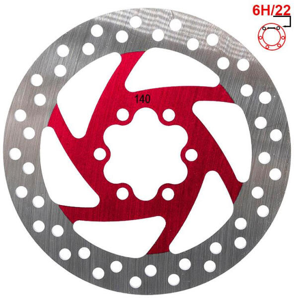 Roller féktárcsa (140 mm, 6 csavaros, 22 mm, piros)Elektromos roller, kerékpár alkatrész. Lyugatott féktárcsa acélból, piros színű középrésszel. AdatokÁtmérő: 140 mm Felfogatás: 6 csavaros Furattávolság: 22 mm