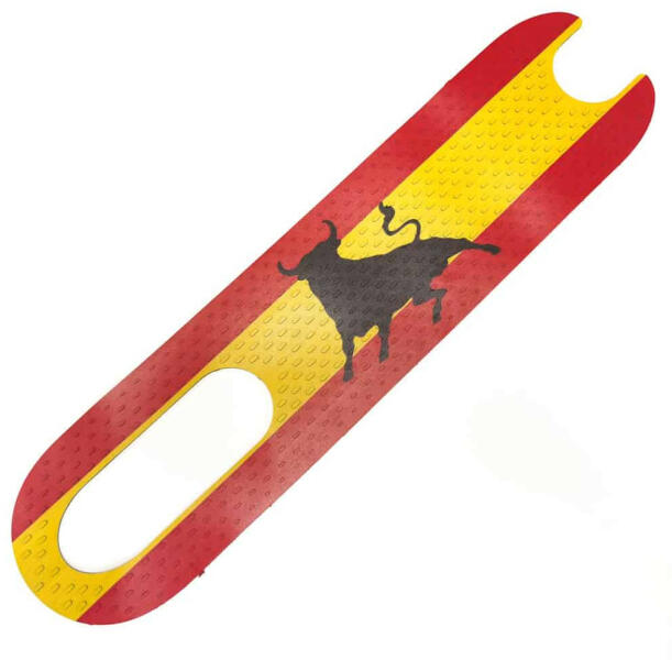 Elektromos roller alkatrésze. Spanyol zászló - bika mintás csúszásgátlós PVC burkolat talprészre. Használható XIAOMI M365, 1S, Essential típusú elektromos roller -ekhez. A PRO modellekhez nem használható, rövid. Ragasztani kell. Felszereléséhez vagy le kell szedni a kormányt (mint amikor a dobozból újonnan kivettük, vagy az elején be kell vágni a gumit.