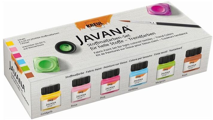 Textilfesték szett világos textilre JAVANA Trend Colors 6x20 ml A festék készlet textilre JAVANA Trend Colors tartalmaz mindent, ami szükséges világos textilekre való festésre. Nagyon jól pigmentált, világos és élénk színek. A festék vízbázisú és folyékonyabb állagú, ezért nem csak vízzel higítható, de a színeket is egymást közt keverni lehet. A szettben a festékeke