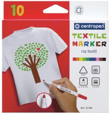 Jelölőkészlet, a CENTROPEN márkától, textilekhez. Nem szükséges vasalni. Ergonomikus markolattal rendelkezik. A marker vízbázisú. A tinta ártalmatlan az egészségre, és fényálló is. Mosása nem egyszerű, ezért 60°C-ig ajánlott a mosás. A marker nyomvonalának szélessége 1,8 mm körüli.
