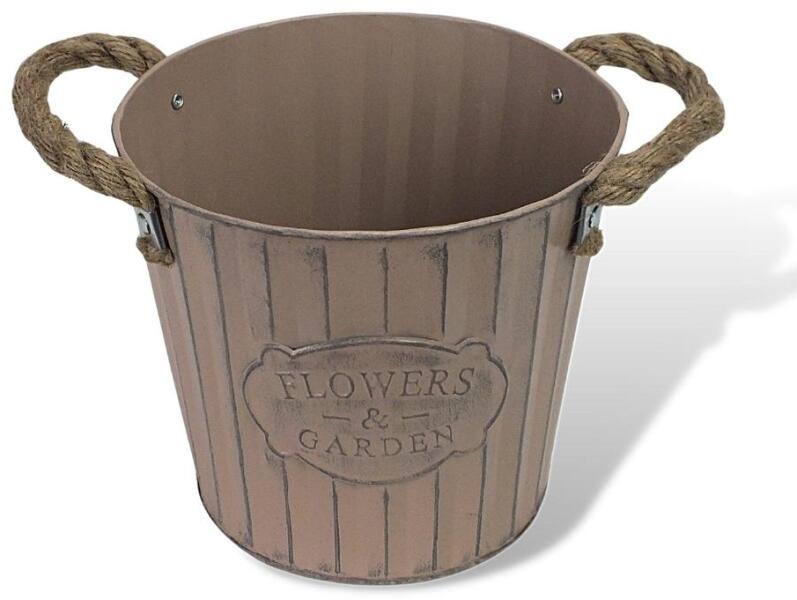 "Flowers & Garden" feliratos magasított bádog kaspó, kötél fülekkel. Strapabíró virágtartó bordázott oldallal, beltérre és kültérre egyaránt. Méret: 18x16cm, talp átmérő: 14cm, tető átmérő: 18cm