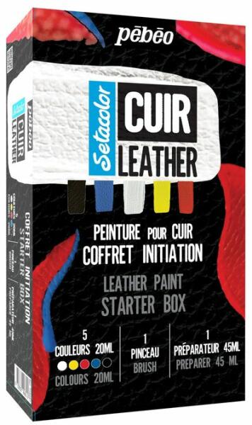 A Pebeo Setacolor Leather Starter Kit 5 alap bőrszínt, egy alapozót és egy ecsetet tartalmaz. A festékek gyorsan száradnak, és ellenállnak a víznek, a repedezésnek, a lepattogzásnak és a fakulásnak.