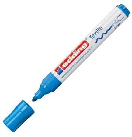 Marker textilekhez, közepes vastagságú kerek hegyű. Szagtalan vízbázisú tintával töltve. A színeket száraz vasalással kell rögzíteni. Rögzítés után a színek 60°C-ig moshatóak. Nyomszélesség: 2-3 mm. Szín: világoskék.