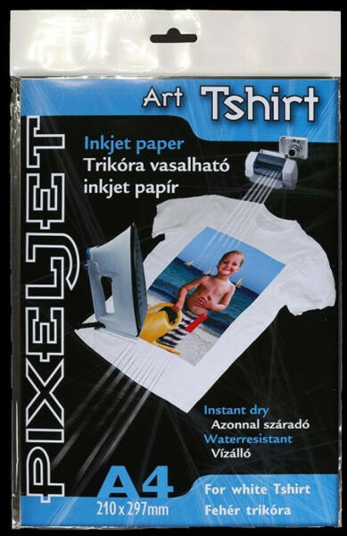 PJ Fotópapír fehér pólóraKiszerelés: 5 lap/csMéret: 210x297 mm Fotópapír tintasugaras nyomtatóhoz. A nyomtatott kép fehér pólóra átvasalható.