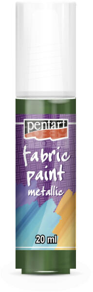 Pentart Textilfesték metál zöld 20 ml 6260 Vízbázisú, jól fedő festék textil díszítésére. Ecsettel, szivaccsal, de közvetlenül a flakonból is felhordható. A megfestett mintát száradás után pamut fokozaton előmelegített vasalóval, vasalópapíron keresztül vasaljuk 30 másodpercig. Az így díszített textil kifordítva, kímélő programmal mosható. Metál színek. Termé