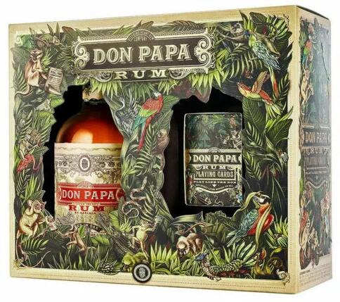 Don Papa Playing Cards Set 40% 0,7l GBA Don Papa rumot a Bleeding Heart Rum Co. gyártja. a Fülöp-szigeteki Negros déli szigetén. A rumot az ország legfinomabb cukornádból származó melaszból desztillálják, majd több mint 7 évig érlelik amerikai tölgyfahordókban, és végül feketeszénen szűrik. A Don Papa nevet Isio Papa története ihlette, aki nagy szerepet játszott a 19. sz