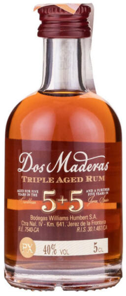 Dos Maderas PX 5+5 mini 0,05l 40%25„Kettős érlelésű rum, bár háromszorosnak tekinthető. A Barbadosról és Guyanából származó rumokat öt évig érlelik a Karib-tengeren, mielőtt Jerezbe szállítják, ahol tovább érlelik a Dos Cortados Palo Cortado Sherry hordók solera rendszereiben, majd Don Guido Pedro Ximénez Sherry hordókban.