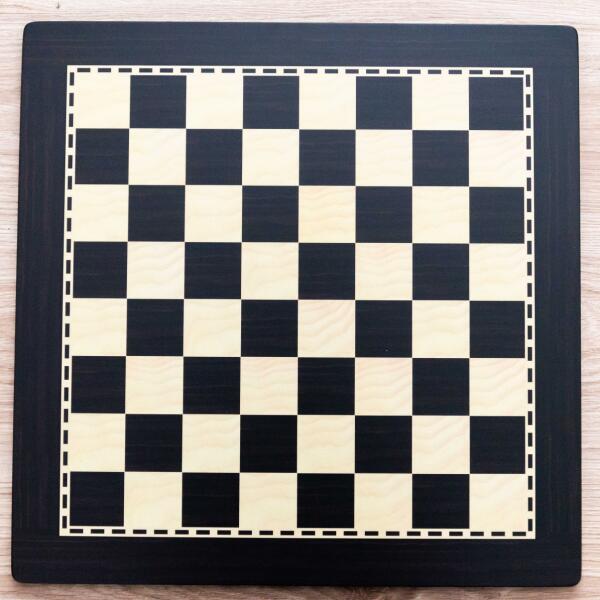 Mezőméret: 5x5 cm, magasság: 1,3 cm Súly: 1,6 kg Táblaméret: 50x50 cm Juharfából készült, fekete-ében színű