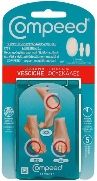 A Compeed vízhólyagtapasz egy áttetsző hidrokolloid tapasz, amely azonnal csökkenti a fájdalmat.