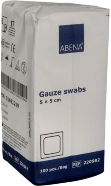 Az Abena gézborogatás 100% pamutból készült. Számos olyan területen alkalmas, ahol nincs szükség steril termékekre. Használhatók többek között bőr- és szájtisztításra, sebtisztításra és kenőcs borogatásként. Latex mentesCsak egyszeri használatraCE I. osztály