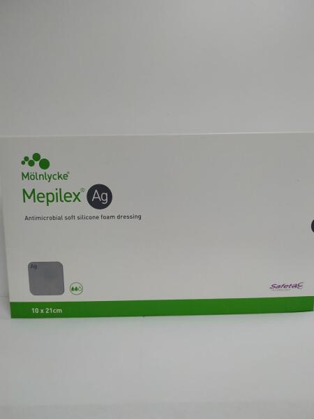 A Mepilex Ag ezüsttel impregnált habszivacs kötszer 10x21 cm, antimikrobiális enyhén vagy közepesen váladékozó égési sérülésekhez vagy sebekhez. Indikáció: Vénás és artériás eredetű fekély, sipoly, decubitus, neuropathiás fekély, epidermolysis bullosa, krónikus nyiroködéma, vasculitis, coagulopathia, traumás sebek, termikus károsodás, tracheostoma, Kock-rezervoár, b