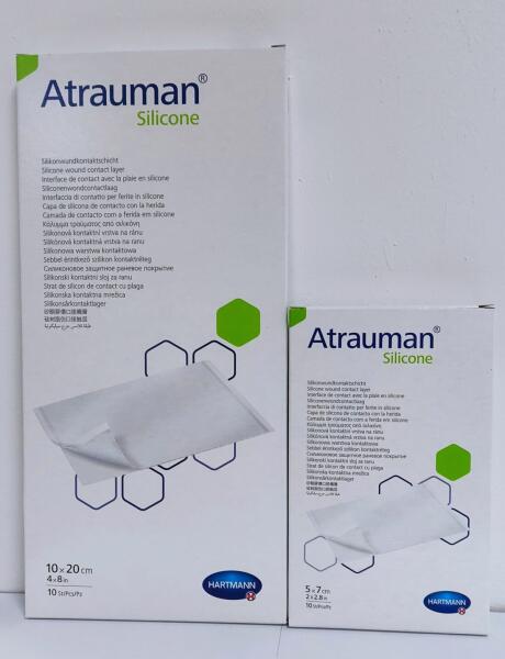 Termék részletekAtrauman Silicone szilikon géllel bevont hidrofób háló Indikáció: Vénás és artériás eredetű fekély, sipoly, decubitus, neuropathiás fekély, epidermolysis bullosa, krónikus nyiroködéma, vasculitis, coagulopathia, traumás sebek, termikus károsodás, tracheostoma, Kock-rezervoár, bőrtranszplantáció. Az Atrauman Silicone hálós kötszer hordozóanyaga polietilén-tereftalát (