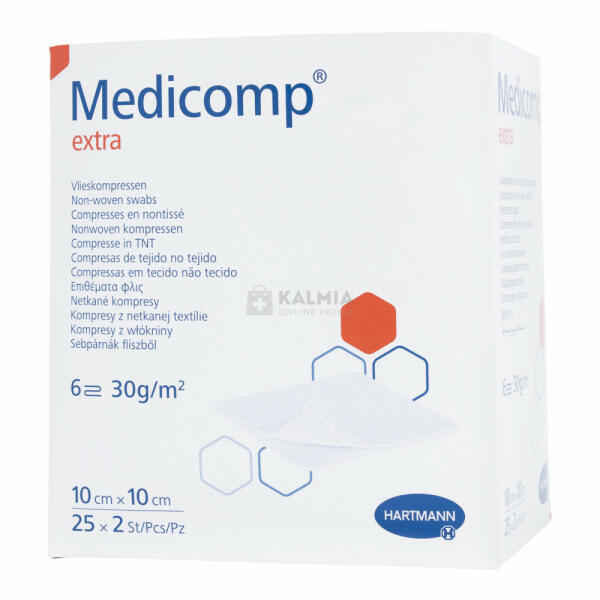 Flíszből készült 6 rétegű nem szőtt sebfedő. 50 darab/csomag. Kettesével csomagolva. A Medicomp sebfedők nagy nedvszívó képességű nem szőtt anyagból készülnek, kötőanyagokat és fehérítőszert nem tartalmaznak. Lágy anyaga jól alakítható, a bőrt nem irritálja. Nem szőtt, flísz alapanyagú sebfedőlap. Leírás: Nem szőtt eljárással készült, nagy nedvszívó kép