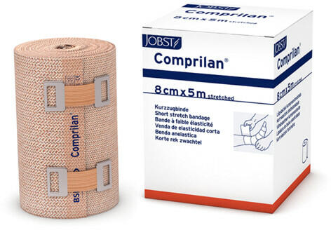 Comprilan, rövid megnyúlású 100% pamutbnól készült kompressziós pólya. Vénás lábszárfekély, nyiroködéma és egyéb ödéma kezelésére. Kompressziót és nagy nyúlásállóságot biztosít a vénás és nyirokvisszavezetés fokozása érdekében. Költséghatékony, ha gyakori kötszercsere szükséges (mosható és akár 10 alkalommal is újra felhasználható). Könnyen alkalma
