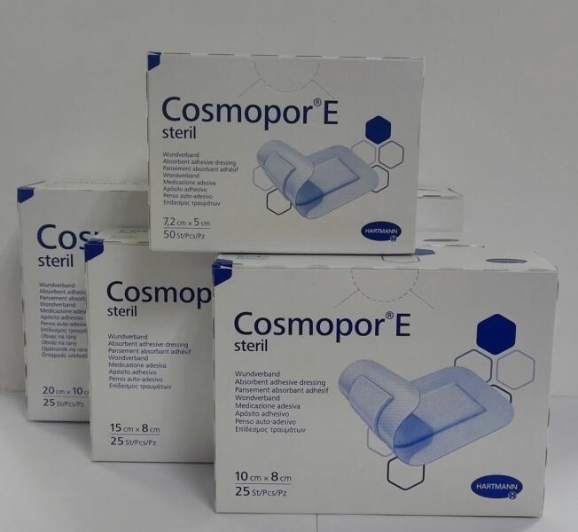 Cosmopor E steril öntapadó szigetkötszer puha flíszanyagból, speciális anyaggal bevont, sebbe nem ragadó párnával. A nagy felületű, biztosan záró ragasztófelületnek köszönhetően a Cosmopor könnyen felhasználható, megbízhatóan tapad és védi a sebet. Jó nedvszívó képesség és párnázóhatás jellemzi, a szintetikus hypoallergén kaucsukragasztónak köszönhetően bőr