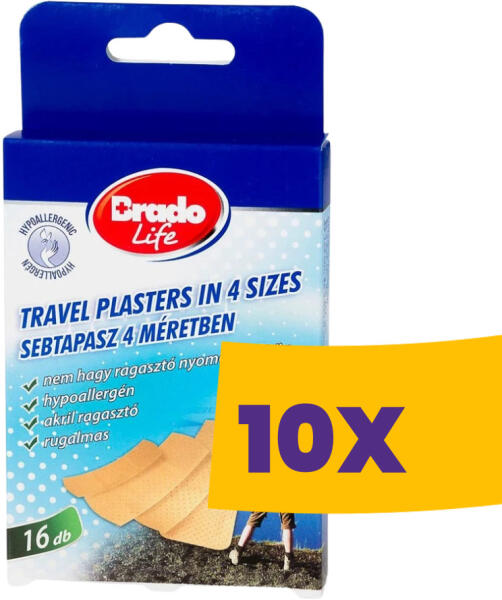 A 16 db-os travel sebtapasz négyféle méretben áll a túrázók, kirándulók rendelkezésére sérülések esetén. A hipoallergén BradoLife sebtapaszok puha, rugalmas anyaguknak köszönhetően kiváló komfortérzetet biztosítanak és nem hagynak ragasztó nyomot a bőrön. 4x4 féle méret 16 db sebtapaszt tartalmaz (4 db 2,7x7; 4 db 2x7 cm; 4 db 1x4 cm; 4 db 3,8x3,8 cm) Hipoallergén Puh