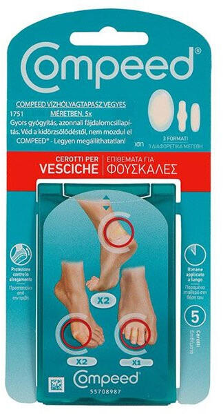 A Compeed® Vízhólyagtapasz vegyes méretben teljeskörű megoldást* kínál a vízhólyagokra. A leggyakrabban használt méreteket tartalmazza: 2 db közepes, 2 db kis méretű és 1 db lábujjra való tapaszt. Ideális neked, a családnak és elengedhetetlen tartozéka az elsősegélycsomagodnak! Termékismertető: A Compeed® Vízhólyagtapasz vegyes méretben orvostechnikai eszköz, amely