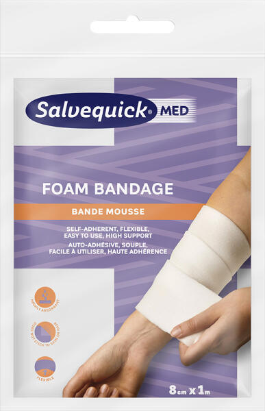 A Foam Bandage öntapadó, ragasztóanyagot nem tartalmazó habszivacsos rögzítőpólya. A habkötöző keresztben elasztikus, nedvszívó, és nem ragad bele a bőrbe, a hajba és a sebbe. Termékismertető: A tapasz rugalmassága miatt könnyen felhelyezhető és kényelmes. Ráadásul vízben is viselhető, és kenőcsökkel és krémekkel együtt is használható. Ez a csomag 1 m hosszú és
