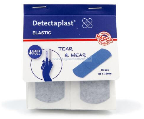 Doboz öt praktikus Easy-Pull csomaggal, egyenként 36 rugalmasan észlelhető kék vakolattal. Tapasz mérete: 25 x 72mm A Detectaplast Elastic tapaszok rugalmasak, rugalmas anyagból készülnek. Ezek a vakolatok nagyon kényelmesek és alkalmasak testrészek mozgatására. Univerzális modell - különböző típusú fali adagolókba illeszkedik 1 Doboz 5 csomag Easy-Pull csomaggal 1 csomagEasy