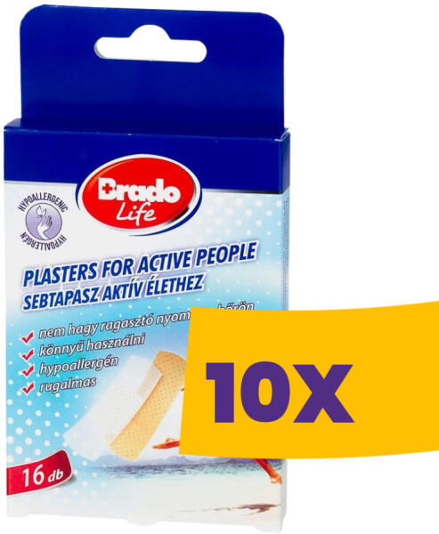 Az aktív életet élőknek ajánlott, szintén 16 db-os sebtapasz a többihez hasonlóan hypoallergén, nem hagy ragasztónyomot a bőrön, rugalmas és kétféle méretben található a dobozban, hogy különböző méretű sérüléseknél is használhassuk. A hipoallergén Bradolife sebtapaszok puha, rugalmas anyaguknak köszönhetően kiváló komfortérzetet biztosítanak. A doboz tartalma: